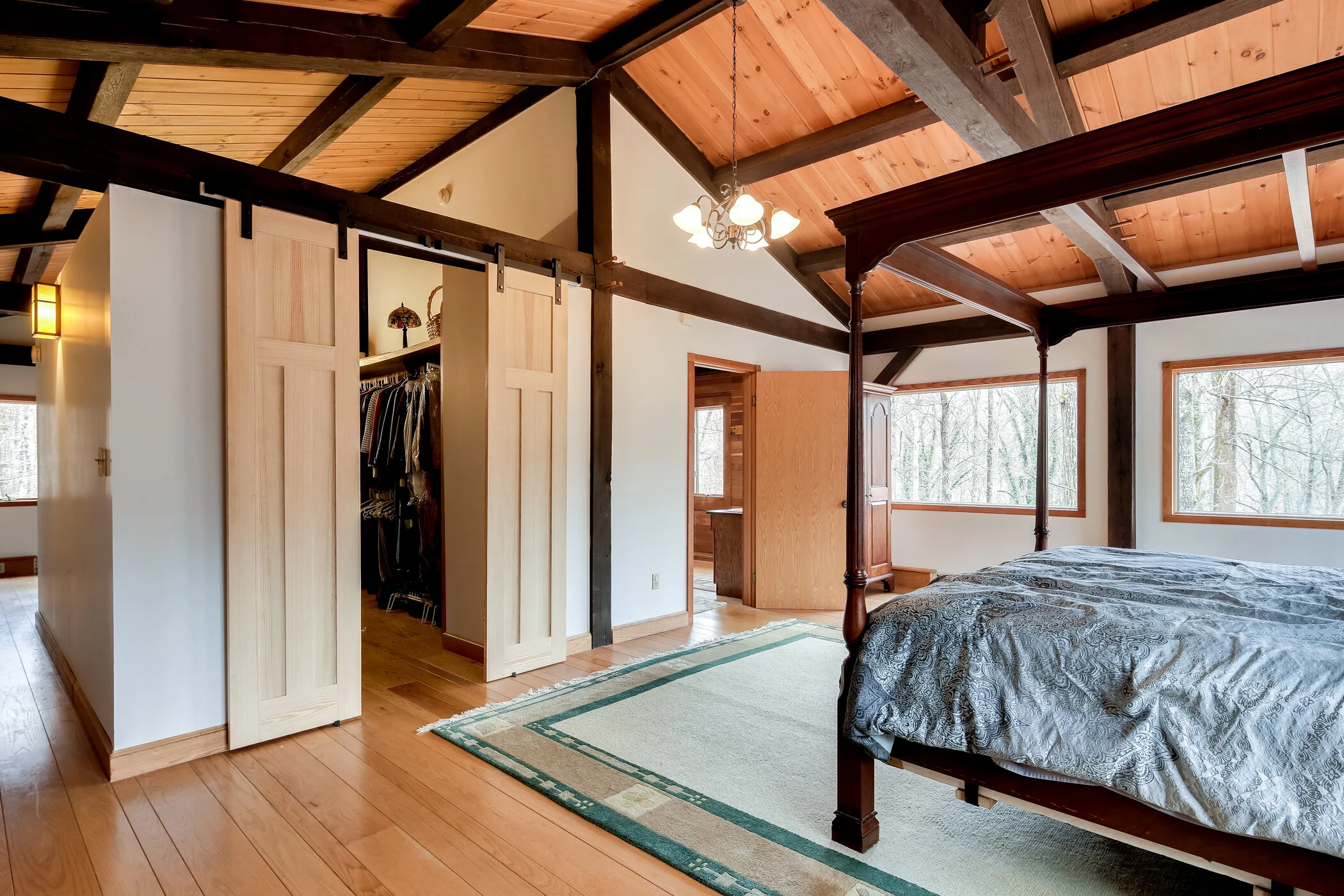 Under vaulted ceilings supported by exposed, true post and beam construction, massive picture windows bring light softened by the mature trees in. Varying width hardwood floors, stacked stone hearth and feature wall, and a vast, warm, open living space create space for both entertaining and contemplative, quiet thought by the fire or built-in book cases.